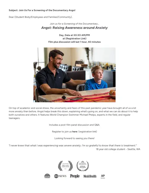 Do you suffer from anxiety? Does your child? Partner? Learn how to cope & find hope. ANGST screening on XXX, XX/XX: ____________