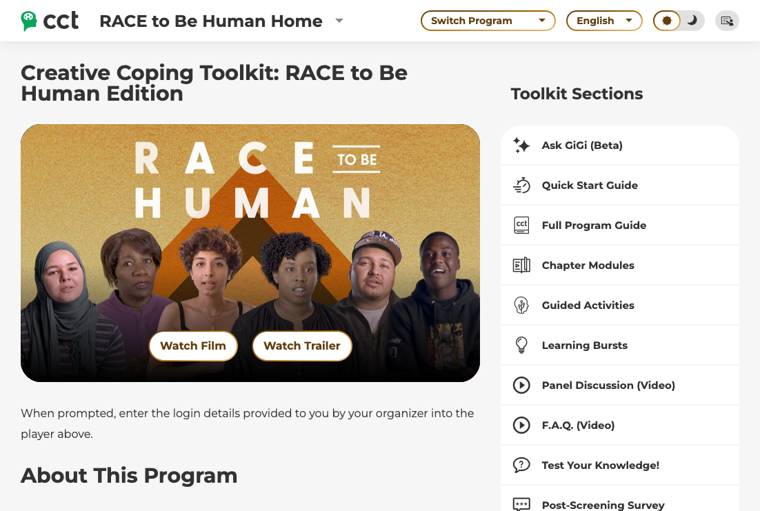 Available as part of the Creative Coping Toolkit, Race to Be Human weaves together real stories with insight from kids, parents, brain scientists, educators, mental health practitioners, technologist and diversity and inclusion experts. Recommended age is 10+ to senior citizens.